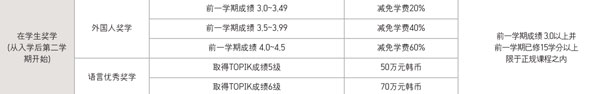 如上图东国大学本科在学生奖学金政策表所示,韩国的大学还会根据在读期间留学生的语言成绩提供一定的奖学金。