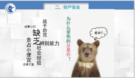 随后,董老师从盗窃、诈骗、传销和抢劫四个方面讲述了如何保护财产安全的问题。她特别为大家列举了生活中常见的诈骗形式,例如:电话冒充熟人、网络冒充熟人、冒充公检法、注销校园贷等电信诈骗。董老师还特别强调同学们校内外出行安全以及乘坐车辆等安全问题,避免被盗被骗。